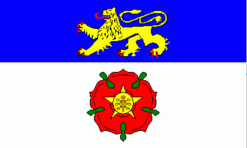 The shield is divided per fess. Above in ablue field is a golden (=yellow), double queued, statant lion armed and tongued red. Below in a silver (=white) field is a red medlar blossom barbed green and seeded golden (= yellow).