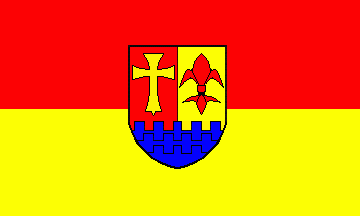 The flag's ratio is 3:5. It is a red over yellow horizontal bicolour with the coat of arms in the centre of the flag.