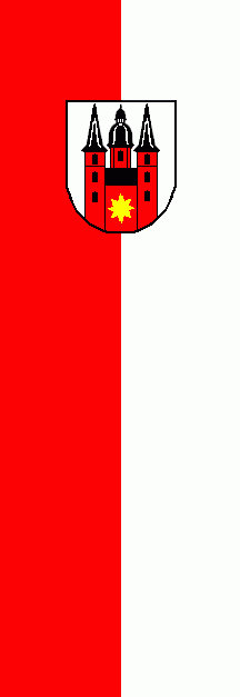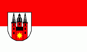 The flag's ratio is 3:5. It is a red over white horizontal bicolour with the coat of arms shifted to the hoist.