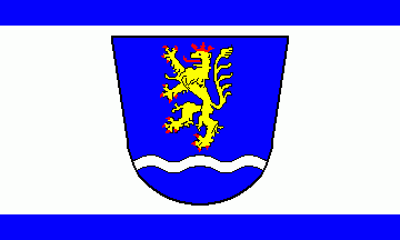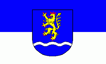 The ratio is 3:5. It is a blue over white horizontal bicolour. The coat of arms is in the centre of the flag. Please note that probably there exists no such flag.