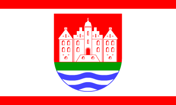 The ratio is 3:5. It is red - white vertical bicolour. A slightly modified version of the coat of arms - roof white, port and windows red - is in the centre of the flag.