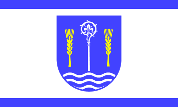 The ratio is 3:5. The ratio is 3:5. It is a white flag with a blue stripe at the top- and bottom-edge. The municipal coat of arms is in the centre of the white stripe.