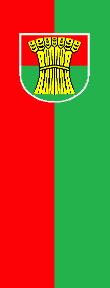 The shield is divied per fess into red over green. A golden (= yellow) sheaf of grain is superimposing both fields. The arms on flag have a white fimbriation.