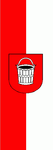 The flag's ratio is 3:5. It is a red over white horizontal bicolour. The coat of arms is in the centre of the flag.