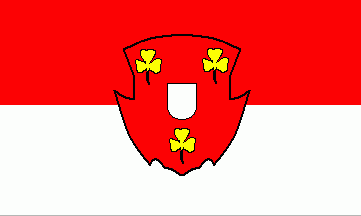 The flags ratio is 3:5. It is a red over white horizontal bicolour. The coat of arms is in the centre of the flag.