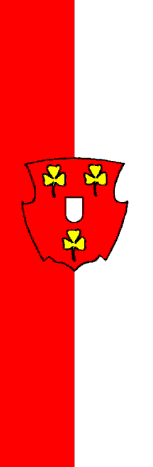 It is a red - white vertical bicolour. The coat of arms is in the centre of the banner.