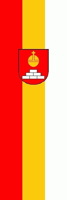 It is a red - golden - white vertical tricolour. The coat of arms is shifted to the top. The golden colour is realized as yellow with a sting of orange.