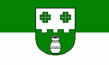 It is a green over white horizontal bicolour. The coat of arms is in the centre of the flag.