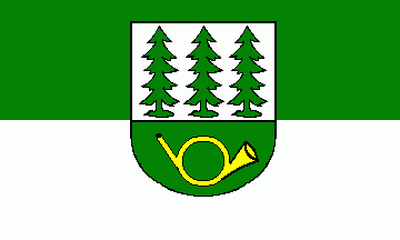 In a silver shield are three green fir trees ordered per fess. The green base is superimposed by a golden (= yellow) post horn.