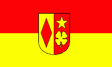 It is a red over yellow horizontal bicolour. The coat of arms is in the centre of the flag.