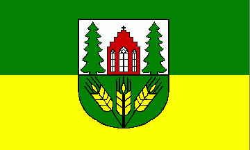 The shield is divided per fess into silver (= white) over green. Above between two green fir trees stands a red church with three Gothic orgive windows and a stepped gable, which is crowned by a black cross. Below are three golden (= yellow) ears of grain ordered like a fan.