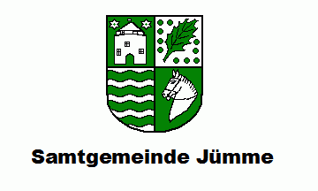 It is a white flag. The coat of arms is in the centre of the flag. Beneath the coat of arms is a black inscription "Samtgemeinde Jümme". According to the local Hauptsatzung the colours of the municipality are silver (= white) and green.
