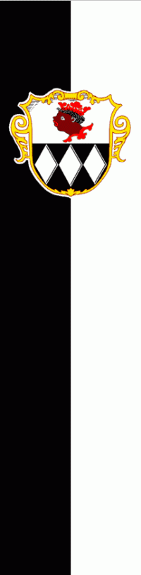 It is a black - white vertical bicolour. The coat of arms is shifted to the top. This flag is interesting enough, as it is one of the rare municipal flags with the colour combination black and white, and the coat of arms shows a moor's head with dark brown colour, so we have black and dark brown in this flag. The moor's head is black in the official blazoning, but is shown brown on the flag.