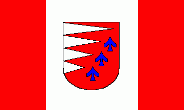 In a red field are four silver (= white) horizontal wedges and three blue arrowheads ordered sinister bendily.