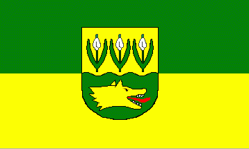 The flag's ratio is 3:5. It is a green over yellow horizontal bicolour. The coat of arms is in the centre of the flag.