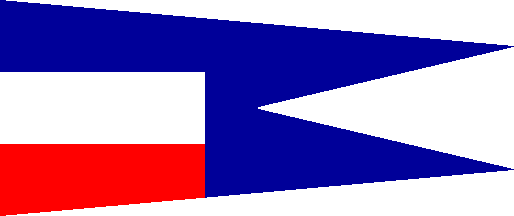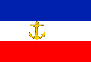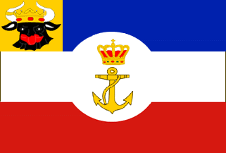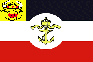 Horizontal tricolor blue-white-red with a white circular cut-out in the blue and red stripe. In the white central disk a yellow fouled anchor crowned with the Royal crown in gold. In the canton (with the height of the blue stripe a yellow square with a black Mecklenburg oxhead). In use from before 1871 until 1918.