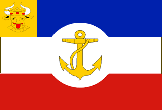 Blue-white-red horizontal tricolor with circular cut-out as in the Imperial service flags (such as the State Ensign 1893-1921), in the circle a yellow fouled anchor and in the canton an oxhead as in the State Ensign 1893-1921. In use 1921-1935. Illustrated in Große Brockhaus 1928, vol. 4, p. 656.