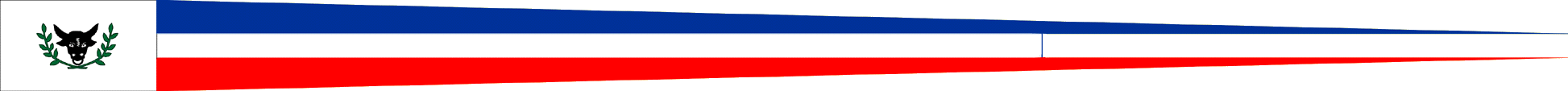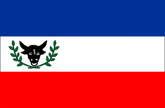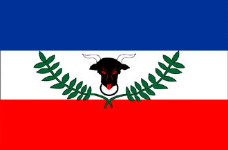 Horizontal tricolor blue-white-red. In the white stripe at hoist a wreathed black oxhead.