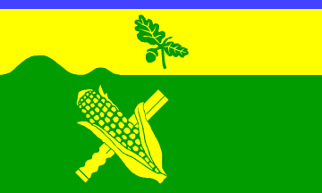 The shield is divided per fess elevated. The fess is twice embowed on the dexter side, the first elevation is higher. Above in a golden (= yellow) field is a green branch of oak with two leaves and one acorn. Below in a green field is a golden (= yellow) corncob crossed with a stick of the same colour. The shield has a plain blue chief, not more than a horizontal stripe at the top edge.