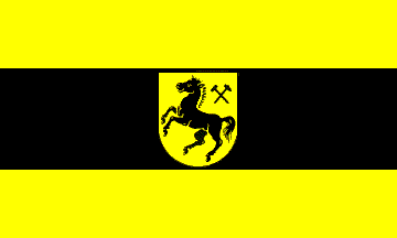 sinister, black mining tools in saltire. The arms show a simplified combination of those granted in 1929 to the city of Wanne-Eickel and in 1900 to Herne. The black horse (Wanne-Eickel) refers to the wild horses which in the past could be found in Emscherbruch, the mining tools (Herne) refer to the mining industry tradition. The city's colours are yellow-black-yellow.