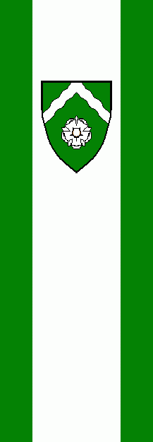 It is a green - white - green vertical triband with ratio 1:3:1. The coat of arms is shifted to the top.