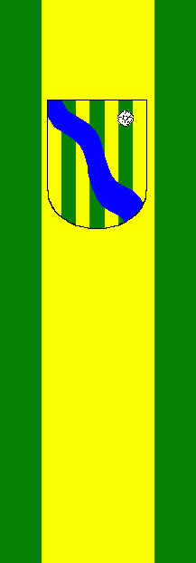 It is a green - yellow - green vertical triband with ratio 1:3:1.The coat of arms is shifted to the top.