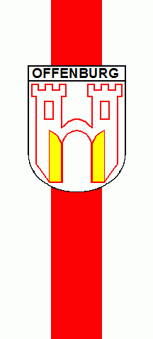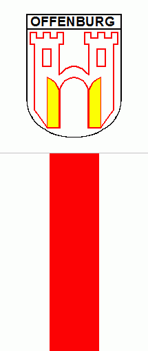 It is a white - red -white vertical triband. A modified coat of arms is in the centre of a white bannerhead. The arms are topped by an inscription in black initials "OFFENBURG" in a black frame.