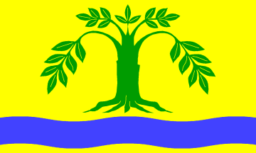 In a golden (= yellow) field is a green, rooted tree above a blue fess wavy.