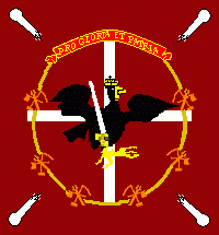 This flag has a ratio of approximately 19:18. It is a dark red flag with a white Greek cross in its centre, in each corner is a white flying cannon ball, the cross is surrounded by a golden rope, which is superimposed by 6 golden bundles of tools, each containing a spade, a hammer, an axe and a mattock. The upper part of the rope is superimposed by a red scroll with motto in golden letters. In the centre of the flag is the Prussian eagle (pattern 1740) superimposing the cross. Sources: Sources: [neu39a]; p.37