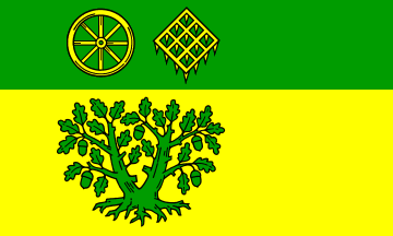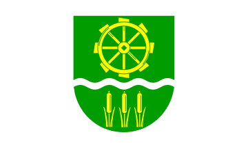 The colours are symbolizing the landscape consisting of meadows, fields, swamps and groves. The wheel is symbolizing the agility of the inhabitants. The harrow is symbolizing agriculture. The oak is a symbol of the undissolvable union of Schleswig and Holstein, the community of the inhabitants. On the other hand the tree is alluding to the vast woods of the municipality.