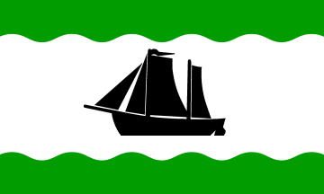 The green shield is divided by a very broad silver (= white) fess wavy, filling nearly half the shield. The fess is superimposed by a black sailing ship with two masts.
