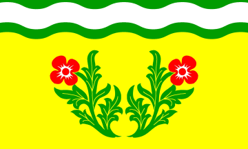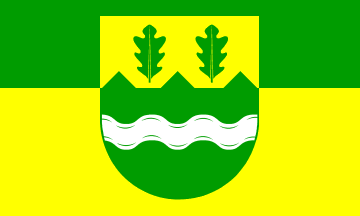 The ratio is 3:5. It green over yellow horizontal bicolour. The lower stripe is broader. The coat of arms is in the centre of the flag.