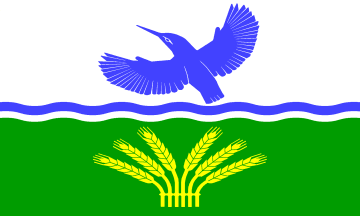 The ratio is 3:5. It is a white flag. The coat of arms is in the centre of the flag. A green wavy line is continuing the fess wavy from the arms to both ends of the sheet.