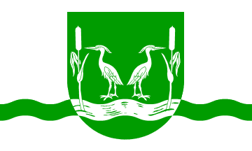 The green shield is divided by a silver (= white) fess wavy on the base with two silver (= white) reed maces issuant and seeded black. Between the maces are two averted, silver (= white) herons.