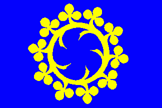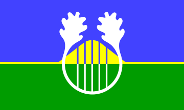 The ratio is 3:5. It blue over green bicolour separated by a yellow fimbriation. For further details see the description of coat of arms below.