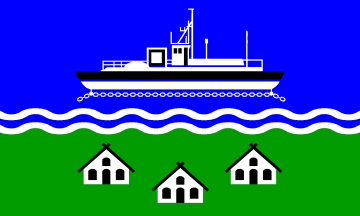 The shield is divided by a silver (= white) bar wavy, superimposed by a blue barrulet wavy. Above in a blue field is a silver (= white) and black hauled ferry. Below in a green field ar three silver (= white) houses ordered 2:1.