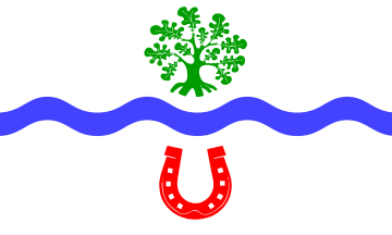 The silver (= white) shield is divided by a blue fess wavy. Above is a green, rooted oak tree, below is a red horseshoe.