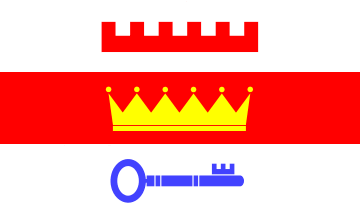 The silver (= white) shield is superimposed by a red fess, which is superimposed by an unspecified golden (= yellow) coronet with six spikes. Above is a red "mural crown" with six pinnacles. Below is a blue key.