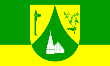 The axe is alluding to the numerous prehistorical excavations on the area of the municipality. The buckwheat is symbolizing the poor soil. The image of the local church had been chosen, because the building is a property of the municipality and independent from the North Elbian church. Furthermore the style of the church is unique. The green colour is symbolizing agriculture.