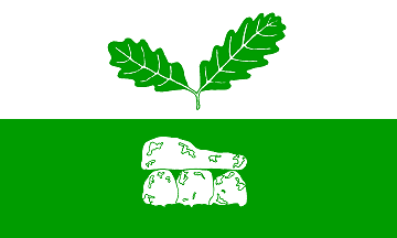 The shield is divided per fess into silver (= white) over green. Above are two green oak leaves. Below is a silver (= white) megalithic tomb.