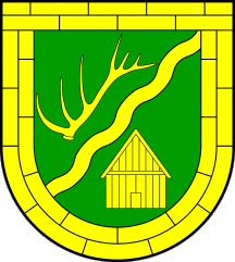 The bordure is symbolizing a local brickyard, which existed for many decades. The hut is a canting element. The seven ends of the antler are symbolizing the seven streets of the municipality. The bend wavy is symbolizing the Mühlenbek, a creek. Finally the green colur is symbolizing agriculture.