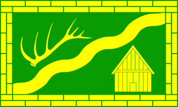 The ratio is 3:5. It is a green over yellow horizontal bicolour. The green stripe has approx. double width. The coat of arms is in the centre of the flag.