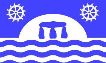 In a blue shield over blue and silver (= white) waves is a silver (= white) hill superimposed by a blue megalithic tomb. Two silver (= white) millwheels are placed upon both outer chiefpoints.