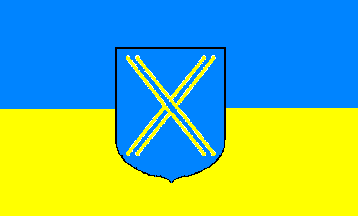 The flag's ratio is 3:5. It is a blue over yellow horizontal bicolour with the coat of arms in its centre.