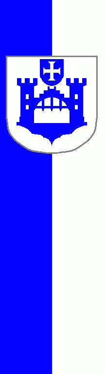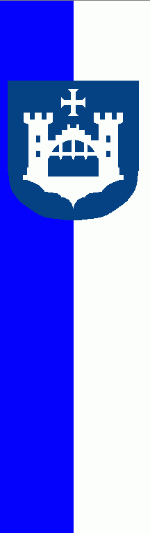 It is a blue - white vertical bicolour. The coat of arms is shifted to the top. Variant #1(left image) displays the full arms, variant #2 (central image) a simplified version with grey edge, variant #3 (right image) a version with inverted tinctures.