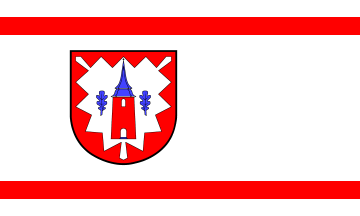 The ratio is 3:5. It is a white flag, horizontally divided by two red stripes. The coat of arms is between the stripes and shifted to the hoist.
