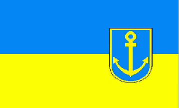 In a blue shield with a golden(=yellow) bordure is a golden(=yellow) anchor. According to Stefan Schwoon's database the coat of arms hasn't changed after 1972. See e.g.