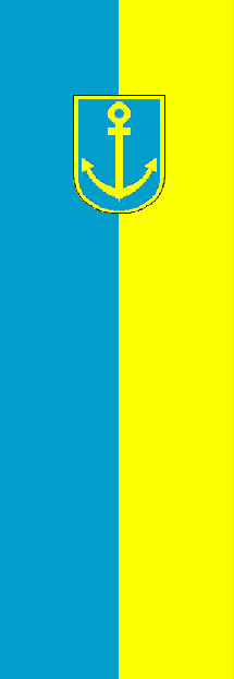 The flag's ratio is 3:5. It is a blue over yellow horizontal bicolour with the coat of arms shifted to the fly.