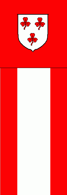 It is a red - white - red vertical triband with ratio 1:3:1 and a red bannerhead. The coat of arms is in the centre of the bannerhead.
