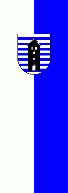 It is a white - blue vertical bicolour. The coat of arms is shifted to the top.
